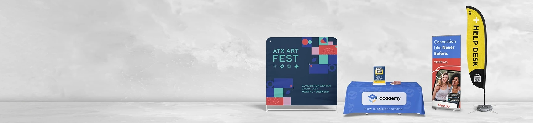 Give your event table a professional finish with our custom table throws. These full-size printed tablecloths drape over 4 ft, 6 ft, or 8 ft tables, showcasing your logo or design across the front and top. They’re made of wrinkle-resistant, flame-retardant polyester and are machine-washable for repeated use.